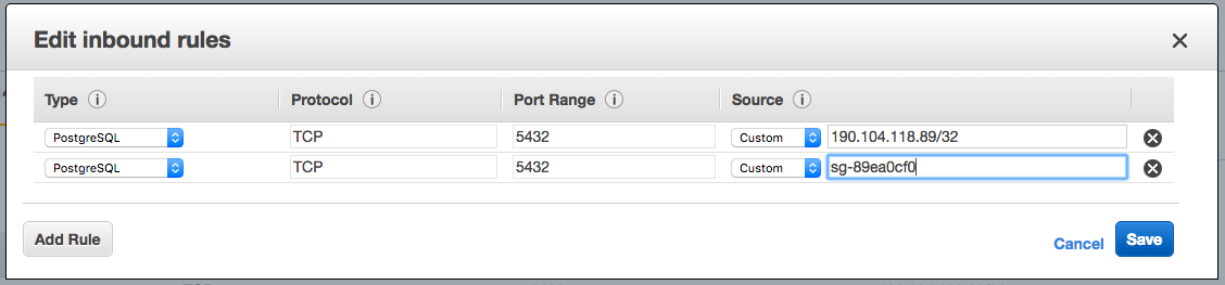 group and edit the inbound rules. Choose the rule type to be PostgreSQL